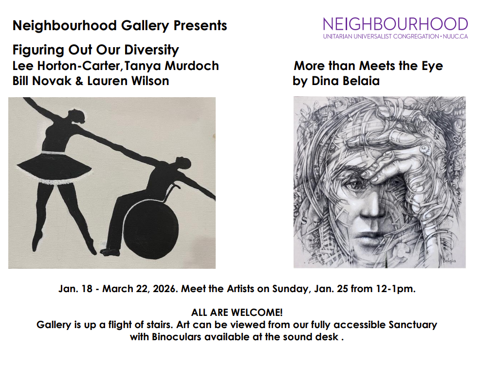 Artists gracefully sharing diversity: Lee Horton-Carter Tanya Murdoch Bill Novak Lauren Wilson All works are for sale through the artist. This show runs from Jan. 18- March 22, 2026 Curatorial Statement The cultural movement towards individuality is growing. Personal growth and self-awareness are becoming more accepted in our culture. We should applaud this growth. This show is a celebration in diversity. Lee Horton-Carter’s work inspired the idea when she revealed a piece that had a visible minority of ability dancing. This started a dialogue of “what don’t we often see but does exist?”. In some cultures, same sex marriage is illegal punishable by death, in Canada , thankfully, it is commonplace. People in wheelchairs can be chained to inactivity by societies notion of “Can’t”. Yet, the possibilities are as wide as our vision – so some rise above and strive for doing it all. Diversity makes us stronger. We should show off our uniqueness , not, hide it. Labels created about body image, aga, Neurodivergence, ethnicity, sexual orientation, economic strata, even ways with which we navigate the world are often seen as different, possibly even negatively. We should view them as an opportunity on how to do things differently. ~Lauren McKinley Renzetti January 2026